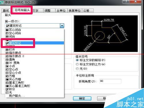 9、在标注样式中,箭头设置为,建筑标注,如图所示。