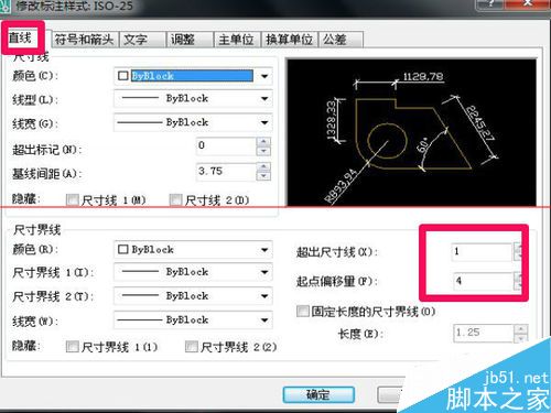 10、标注样式中选择“直线”然后在,超出尺寸线设置1,起点偏移量设置4,如图所示进行设置好后点击确定。