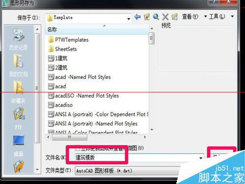 13、在弹出的对话框中,选择文件类型,后缀名改为,dwt。文件名改为,建筑模板,如图所示。