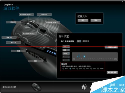 3、从高至低设置鼠标采用率,直至解决鼠标卡顿情况。一般鼠标默认最高采用率,G500s降低至333后情况有明显改善,调整至200后完全解决卡顿情况。