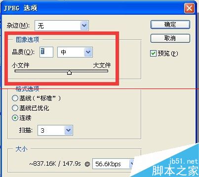 7、保存后会弹出“JPEG选项”对话框,大家将图片的选择为适中,太大的话,处理时候会长一点。最后保存图片,你会发现图片的清晰程度会好很多,注意有的时候还是没有PDF清晰。