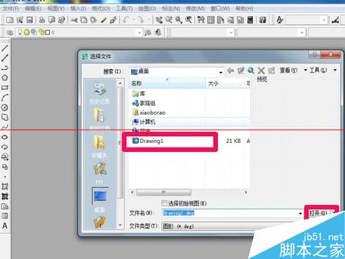 2、在打开的软件中点击“文件”选择“打开”找到自己要定义成块的图形,如图所示。