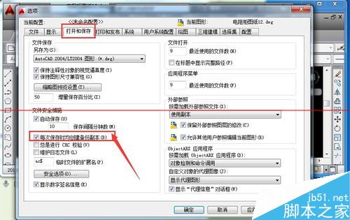 4、在弹出的选项对话页面中,选择打开和保存,在文件安全措施下有一个选项,每次保存时均创建备份副本,这外对勾去掉,然后点击确定,这个图形文件保存时,就不会有相应的*.BAK文件了