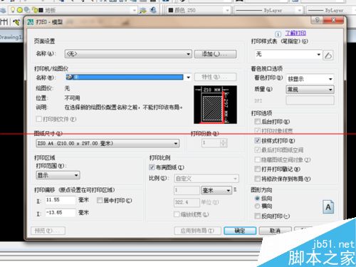 7、设置好之后,点击“保存并关闭”。回到“打印”,选择右下角的“图形方向”,再选择“居中打印”,“布满图纸”。在“图纸尺寸”中选择需要的尺寸,再点击“预览”,查看图纸。