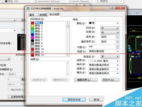 4、鼠标左键点击打印样式的“颜色1”,然后按住Shift键,拖动滚动条到最后的一个颜色,点击"颜色255",选择所有的颜色。再点击“特性”下的“颜色”的“▼”。在下拉菜单中选择黑色。不少的人在打印预览时会发现有的线性还是彩色的,这一步就避免了打印出现这种情况。