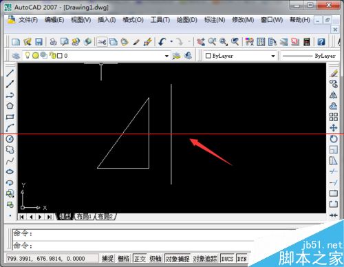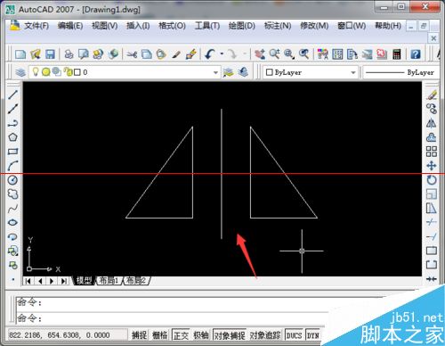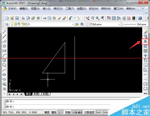 1、CAD草图中是一条直线和三角形,需要在直线的右侧画一个三角形,与左边对称,有多种方法可以实现,最简单快捷的当然就是镜像功能。