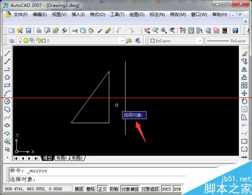 3、首先需要选择镜像的对象,对于本例来说,就是直线左侧的三角形,点击进行选择。