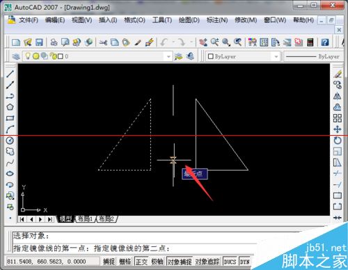 5、在指定直线的第二点的时候,镜像的三角形就已经出来了,选择直线上的第二点,点击即可。