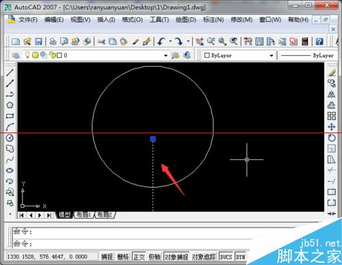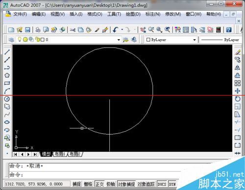 1、对于下图中所示的图形,是由一个封闭图形圆和直线构成,下面要进行的操作就是将直线在交点处打断。