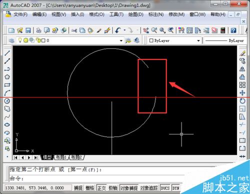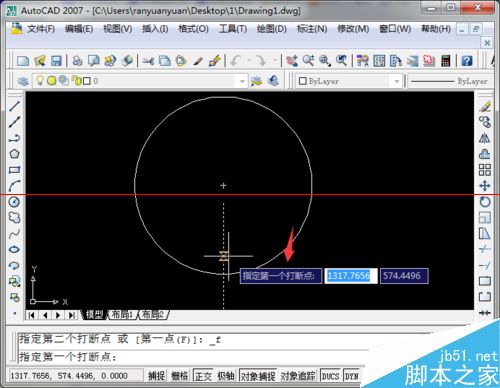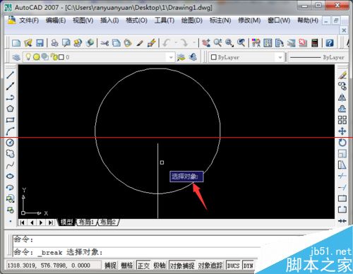 6、此外还可以指定打断一段区域,以图中的圆为例。对应的图标在右侧工具栏的打断于点的下方,点击之后,和打断于点的操作类似。