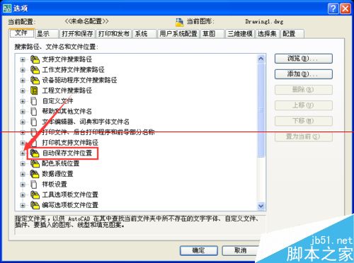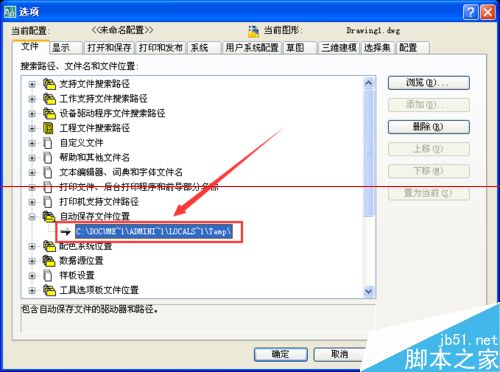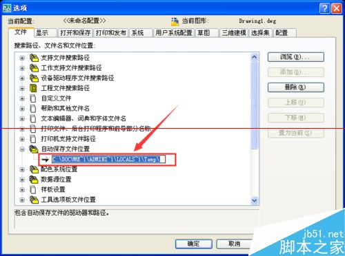 4、展开列表后就可以看到cad自动保存的路径了,这时如果你想复制该路径,先【点击】该路径,如图所示底色变蓝,再次【点击】则会进入编辑模式如图二,这时可以右键复制或ctrl+c。