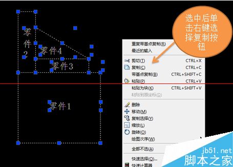 2、打开需要用的CAD图纸,选中图形部分,并单击右键选择复制。