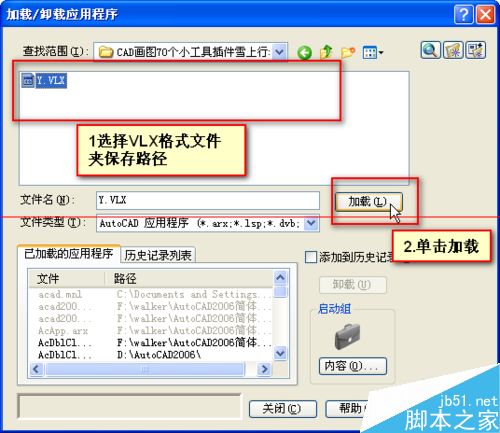 3、然后选择VLX格式的工具插件路径(建议放置到CAD安装目录下方),并点击加载。