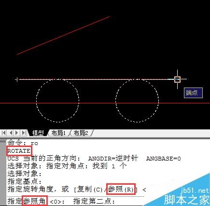 1、命令行输入ro(命令全名rotate),选择图块对象,指定块中直线的左端点为基点(也可选择其他点,这里为方便选择此点),要求旋转角度时键入R(参照选项),点取块中直线的两个端点获取参照角度。