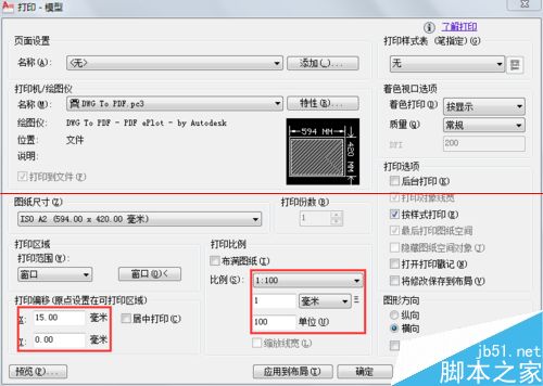 3、在绘图仪出图时,需要按照最终的出图比例打印,这时不能勾选”居中打印“和”充满图纸“,需要自定义比例并输入具体数值,如下图中1毫米对应100图形单位就是打印比例为1:100。通过“打印偏移”里对原点的偏移设置可以让打印内容在纸张上更为居中。