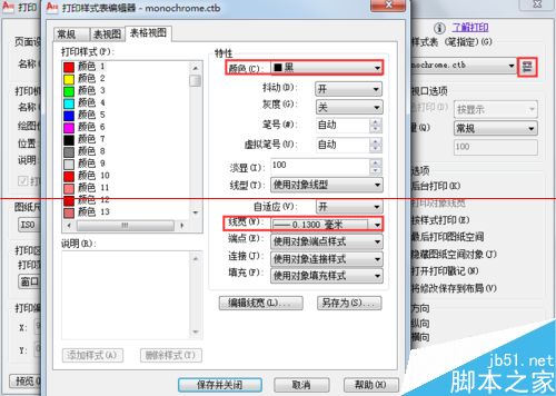 5、通常最终的图纸都是黑白打印,并且按照行业习惯针对一些颜色设置不同的线宽,可以通过“编辑”当前的样式表或者新建样式表设置并保存常用的样式设定。在样式表编辑器中,通常的习惯是将1~255色号的颜色统一设置为黑色,再对一部分常用色号分别设置线宽,例如将1号色(红色)的线宽设为0.13,2号色(黄色)的线宽设为0.25等。