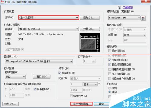 7、可以将当前设置“应用到布局”以便在后续打印中继续使用,或者在后续打印时在页面设置中选择“上一次打印”避免重复设置,每次打印时仅需要窗选要打印的区域即可。