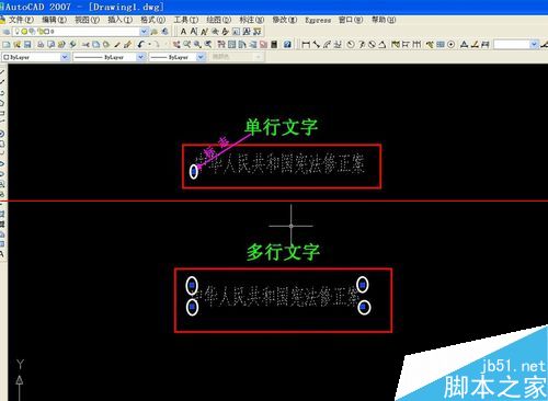 1、打开CAD绘图软件,我们输入单行文字、多行文字。大家看图,虽然一样的字,单行文字鼠标点击出现左下角一个点,而多行文字出现一个框(四个点)。