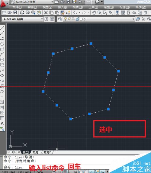 2、选中图形,后输入list命令,回车或空格。