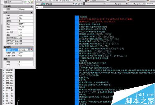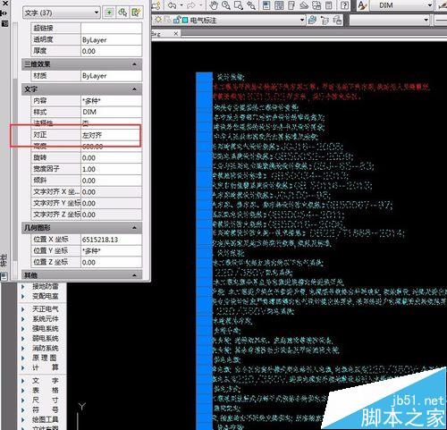 4、当然 有的时候这个多种的位置我们无法将刚才复制来的坐标沾上去,原因是你的字体当中对齐方式不统一 我们需要选中所有字体并在属性框中,“对正”里选择一种对齐方式 比如左对齐 然后重复第三步就可以了