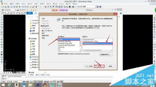 5、在打开的“添加绘图仪——绘图仪型号“页面,生产商选择Adobe,型号选择PostScript Level2,再单机【下一步】按钮。
