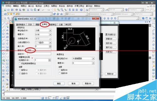 4、在修改对话框中,点击主单位,再在前缀中输入我们的直径代码%%C重要。