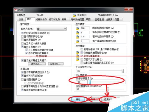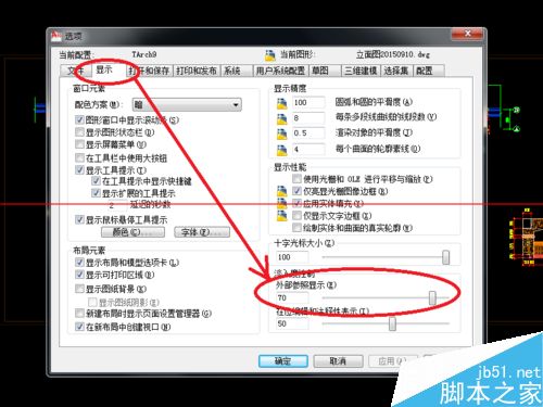 4、点击“选项”,弹出一个“选项”对话框,该对话框的左上角有个“当前配置”字样,在其下方有一排按钮,切换到“显示”按钮,在右边一栏找到“外部参照显示字样”,下面有一个数值和一根拉条,如图所示: