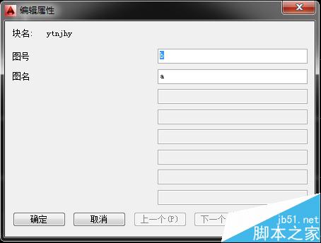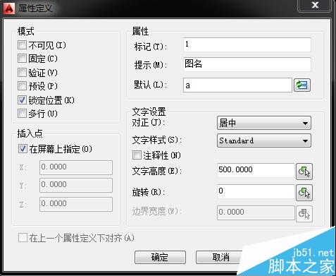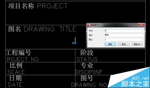 4、上图中“1”和“2”是两次att命令后的结果。下面要进行的步骤是,把图框和“1”“2”都选中,定义成块(块命令为“b”),定义成块后会出现如下对话框,在这个对话框中,左侧是“提示”项中的内容,右侧输入框中的内容为“默认”项中的内容(现在可更改,可不更改,这里先不更改),然后确定或关闭此对话框。