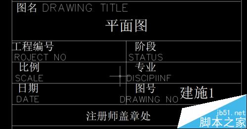 7、我在上述对话框中输入“属性”选项中的值“a”改成“平面图”;“b”改成建施1“。确定之后,看到的结果如下图。这个时候读者应该知道了吧,然后你可以把此块多个复制,双击其中的两个“值”,是可以输入自己想要的内容的,而不会改变前面块的内容,不像直接的块一样,改了其中一项,后面复制的块都会改变,这样我们就可以在图框中添加多个att命令,放到多个位置,在定义成块,修改其中的图名、图号什么的。