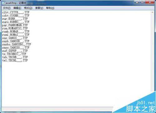 3、根据路径找到“acad.fmp”文件,并用Windows系统的自带的文本编辑器“记事本”打开该文件。
