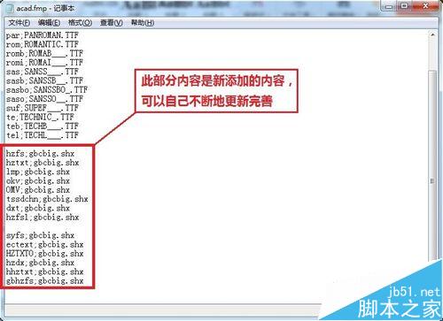 4、在打开的“acad.fmp”文件中,将你缺少的字体映射为“gbcbig.shx”字体。例如缺少“hzfs”字体,就在文件中添加内容“hzfs;gbcbig.shx”。缺少的字体和“gbcbig.shx”之间用英文的分号“;”隔开。