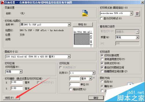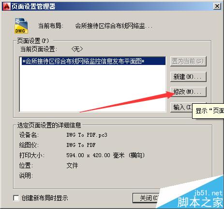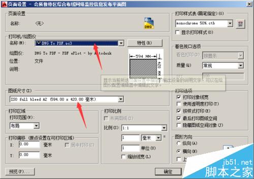 4、在弹出的页面设置对话框中将打印机/绘图仪调整为dwg to pdf.pc3,同时选择合适的图纸尺寸,如下图: