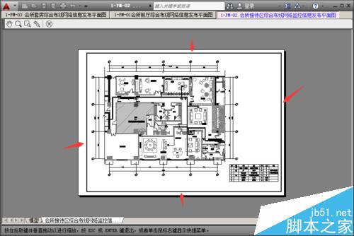 6、在弹出的打印预览界面中查看所设置的图框是否超出打印机或绘图仪的打印范围,如下图的四个箭头标识区域,可以看到图框均没有超出打印范围。