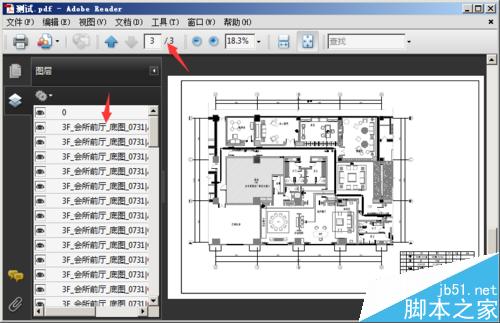 13、打开该pdf文件,可以看到3张图纸到一个pdf中了,同时左侧可以点击要显示或关闭的图层,非常方便。下图为转换完成后的pdf文件,教程结束。