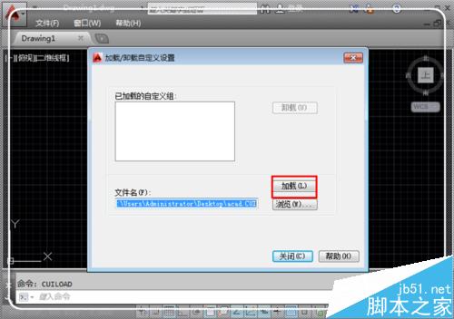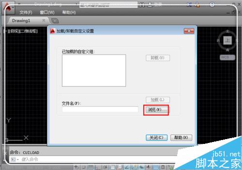 3、CAD中弹出,点击“加载/卸载自定义设置”对话框”左下方的“浏览”,去查找文件。