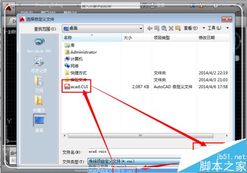 4、先点击文件类型后面的倒三角形,找到后缀为.cui的类型,点击选择,然后找到你刚才下载的“acad.cui”文件,点击它选中,然后点击“打开”。