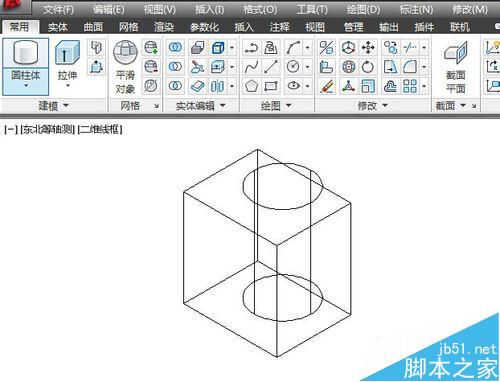 1、几何体的差集运算。我要画的零件是一个长方体,挖去一个圆柱体而成的。因此可以使用差集命令来运算。首先要设置工作空间为三维建模模式,单击菜单栏的视图命令,选择东北等轴测,按功能键F7隐藏栅格。