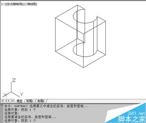 4、如何做差集运算?在底部的命令编辑窗口输入差集运算命令SUBTRACT,回车确认。然后单击要被减去的实体,即长方体,回车。再单击需要减去的实体,即圆柱,回车确认。这样就得到差集实体了。