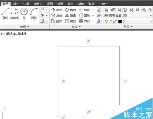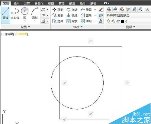 7、单击圆工具再画一个圆,注意圆有一部分在矩形外部。因为没给具体尺寸,就不要输入精确的数据指令了。平面图形的差集计算,必须先把图形先建成面域。只有面域才能进行这样的运算。
