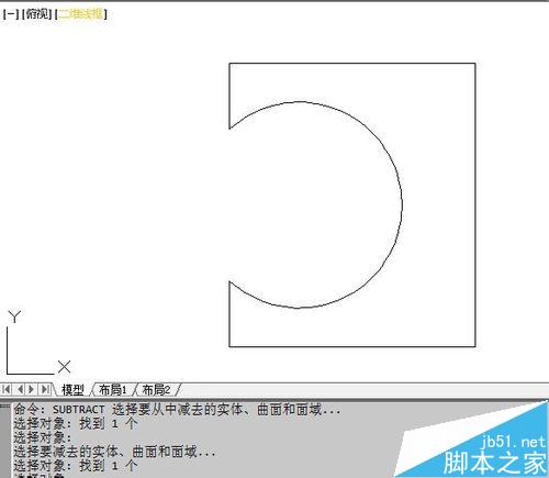 9、如何做面域差集运算?单击差集按钮或在底部的命令框输入SUBTRACT,回车,选中矩形,回车,再选中圆,回车,就得到差集。这个操作方法和几何体的差集运算一样。