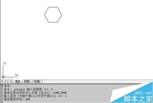 在命令编辑区内输入侧面数:6,回车;输入正多边形中心坐标:1500,2000,回车。输入内接代码:I,回车确认。输入半径200,回车。这样正六边形就画好了。这里要精确定位,所以有关参数使用命令输入方式。