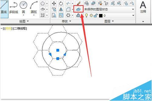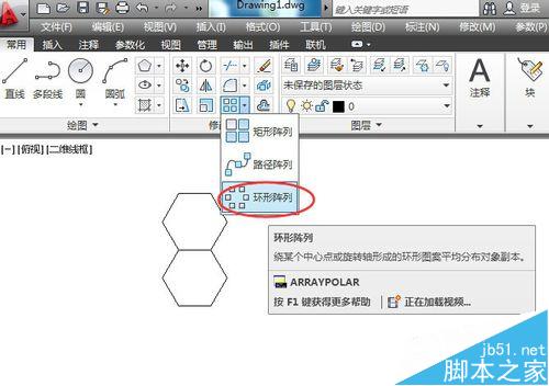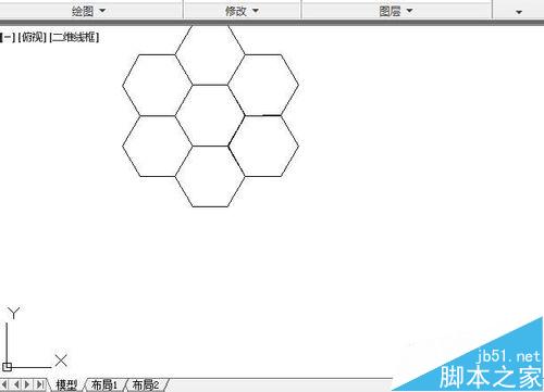 两个正六边形拼接起来了。接下来,要利用环形阵列工具,进行复制和拼接。单击环形阵列工具,选中上下两个六边形,右击确认,在命令编辑栏输入中心坐标:1500,2000,回车。输入项目数:6,确认。