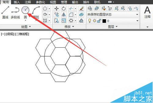 单击常用工具栏上的椭圆工具。在扩充的图形中画一个圆,圆心稍微偏离中心一点,半径选择略小一点,使园外还有六边形的剩余部分。