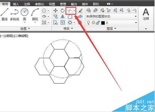 为了修剪多余部分,选中所有的多边形,单击分解工具把图形打散。这一步很重要,没有分解,就没有办法修剪。分解后,指定圆为界限,单击圆外就修剪外边的,保留园内部分。