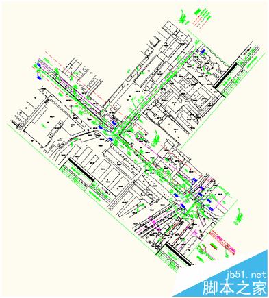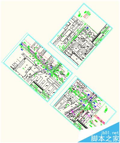 有时,一副竣工图中会将CAD数据分成好几块(如第一个图),这时就需要先确定指北针方向,看各个图块的正北方向是否在屏幕中竖直向上(90°),若并非如此,就需要将其进行“旋转”(‘ROTATE’命令),将其正北方向调到屏幕竖直向上的方向。然后利用“平移”工具(‘MOVE’命令),以图块间公共点为基点,将分开的CAD数据进行重新合并。