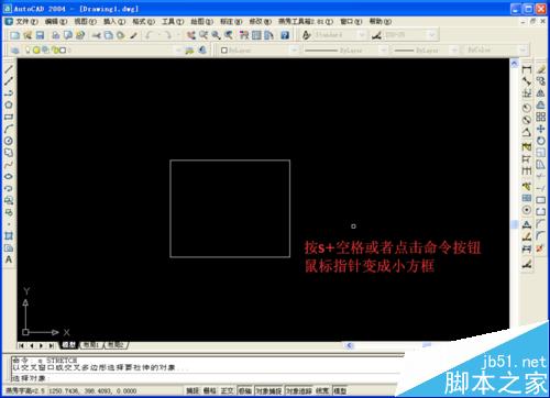 1、按s+空格键或者点击拉伸命令——鼠标变成小方框——接着选着拉伸边或者点