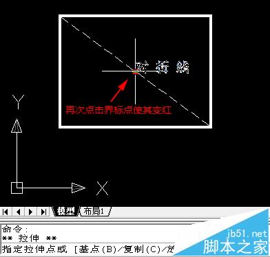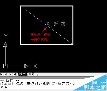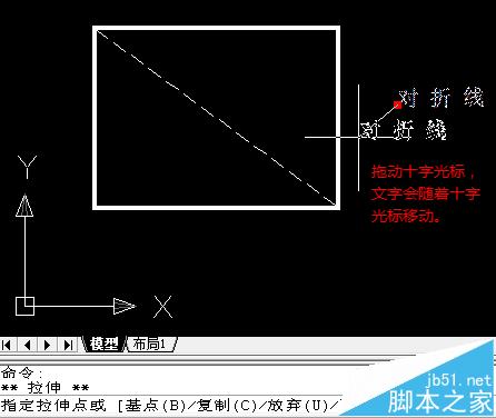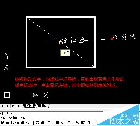 6、继续拖动十字光标(文字也随着移动)靠近虚线中点,直到出现黄色三角形的对象捕捉标志时,点击鼠标左键。这时,文字就被移动到了虚线旁,且仍处于选中状态。