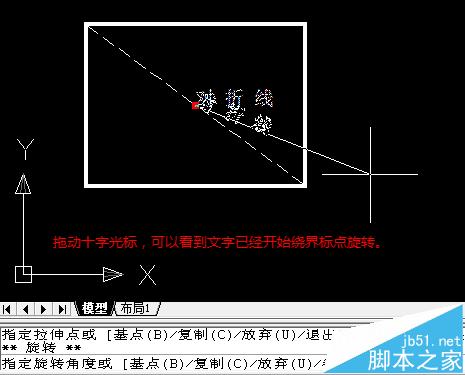 7、再次鼠标左键点击界标点,使其变红。紧接着再点鼠标右键,调出界标点快捷命令菜单,选中其中的“旋转(R)”菜单项。拖动十字光标,可以发现文字已经开始绕界标点(也就是虚线中点)旋转了。