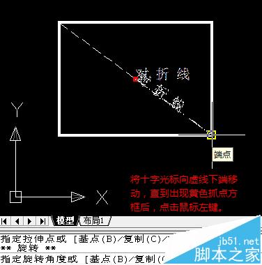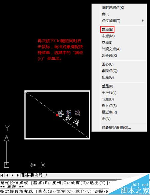 8、再次按住Ctrl键的同时,点击鼠标右键,调出对象捕捉快捷菜单。这次,选该菜单中的“端点(E)”菜单项。然后,移动十字光标靠近虚线下端,直到出现黄色方框所示的对象捕捉标志时,点鼠标左键。至此,文字已经与斜线方向一致,且仍处于选中状态。