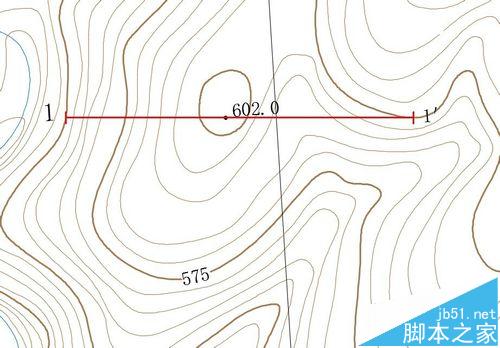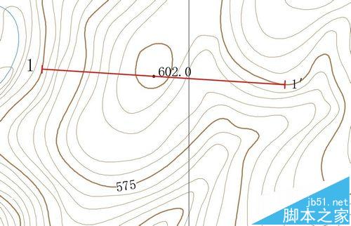 1、以下图中红线为剖面线绘制地形图剖面,首先确认剖面线起点高程,下图剖面线1-1′起点高程为550,等高距为5米,